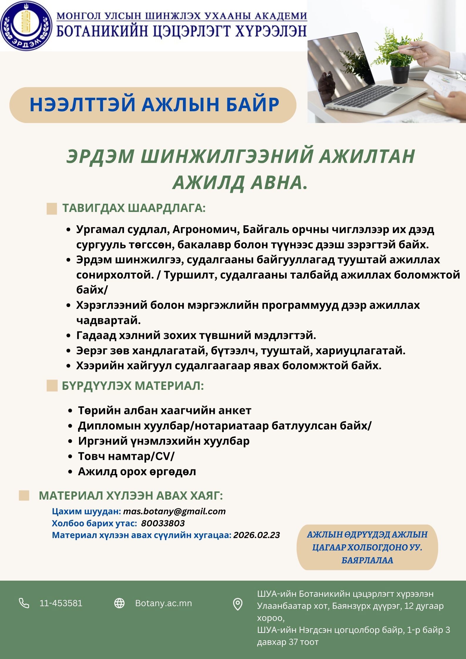 Тус хүрээлэнд эрдэм шинжилгээний ажилтан шалгаруулж ажилд авна. Материалыг эхний шатанд mas.botany@gmail.com хаягаар 2026.02.23-ны өдрийг хүртэл хүлээн авна. /Цаасаа хэмнээд хэвлэж ирүүлэх шаардлагагүй тул, зөвхөн дээрх хаягаар явуулаарай/